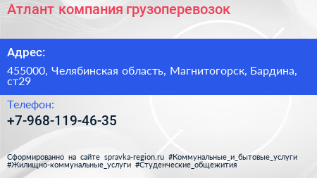 Атлант, компания грузоперевозок по адресу 455000, Челябинская область, Магнитогорск, Бардина, ст29 в дальнейшем Организация, размещена в следующих категориях: