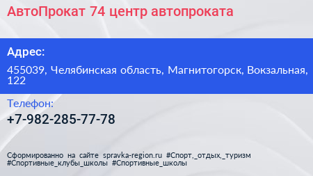 АвтоПрокат 74, центр автопроката по адресу 455039, Челябинская область, Магнитогорск, Вокзальная, 122 в дальнейшем Организация, размещена в следующих категориях: