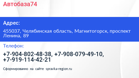 Автобаза74 по адресу 455037, Челябинская область, Магнитогорск, проспект Ленина, 89 в дальнейшем Организация, размещена в следующих категориях: