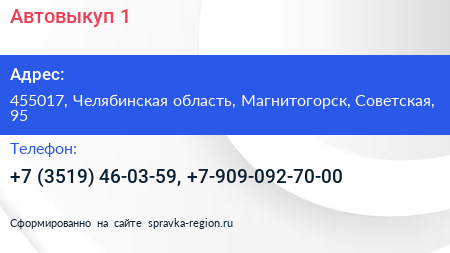 Автовыкуп №1 по адресу 455017, Челябинская область, Магнитогорск, Советская, 95 в дальнейшем Организация, размещена в следующих категориях: