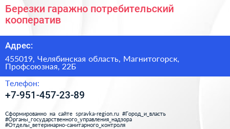 Березки, гаражно-потребительский кооператив по адресу 455019, Челябинская область, Магнитогорск, Профсоюзная, 22Б в дальнейшем Организация, размещена в следующих категориях: