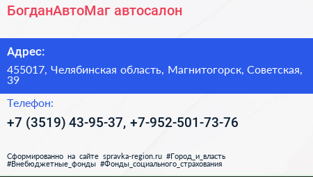 БогданАвтоМаг, автосалон по адресу 455017, Челябинская область, Магнитогорск, Советская, 39 в дальнейшем Организация, размещена в следующих категориях: