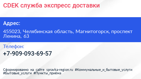 CDEK, служба экспресс-доставки по адресу 455023, Челябинская область, Магнитогорск, проспект Ленина, 63 в дальнейшем Организация, размещена в следующих категориях: