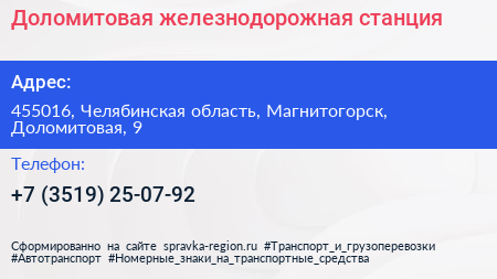 Доломитовая, железнодорожная станция по адресу 455016, Челябинская область, Магнитогорск, Доломитовая, 9 в дальнейшем Организация, размещена в следующих категориях: