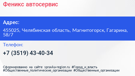 Феникс, автосервис по адресу 455025, Челябинская область, Магнитогорск, Гагарина, 58/7 в дальнейшем Организация, размещена в следующих категориях: