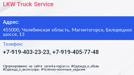 LKW Truck Service по адресу 455000, Челябинская область, Магнитогорск, Белорецкое шоссе, 13 в дальнейшем Организация, размещена в следующих категориях:
