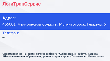 ЛогиТранСервис по адресу 455001, Челябинская область, Магнитогорск, Герцена, 6 в дальнейшем Организация, размещена в следующих категориях: