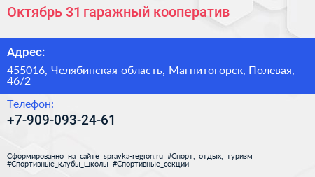 Октябрь-31, гаражный кооператив по адресу 455016, Челябинская область, Магнитогорск, Полевая, 46/2 в дальнейшем Организация, размещена в следующих категориях: