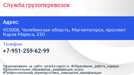 Служба грузоперевозок по адресу 455008, Челябинская область, Магнитогорск, проспект Карла Маркса, 210 в дальнейшем Организация, размещена в следующих категориях: