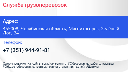 Служба грузоперевозок по адресу 455008, Челябинская область, Магнитогорск, Зелёный Лог, 34 в дальнейшем Организация, размещена в следующих категориях:
