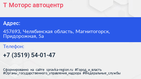 Т-Моторс, автоцентр по адресу 457693, Челябинская область, Магнитогорск, Придорожная, 5а в дальнейшем Организация, размещена в следующих категориях: