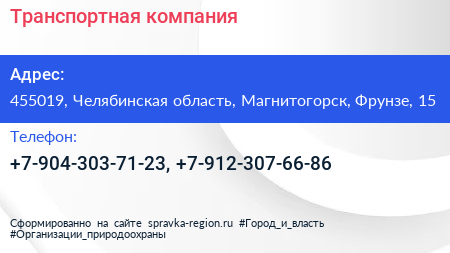 Транспортная компания по адресу 455019, Челябинская область, Магнитогорск, Фрунзе, 15 в дальнейшем Организация, размещена в следующих категориях: