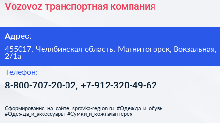 Vozovoz, транспортная компания по адресу 455017, Челябинская область, Магнитогорск, Вокзальная, 2/1а в дальнейшем Организация, размещена в следующих категориях: