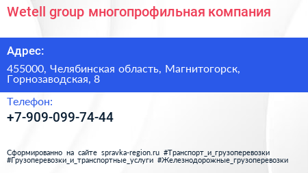 Wetell group, многопрофильная компания по адресу 455000, Челябинская область, Магнитогорск, Горнозаводская, 8 в дальнейшем Организация, размещена в следующих категориях: