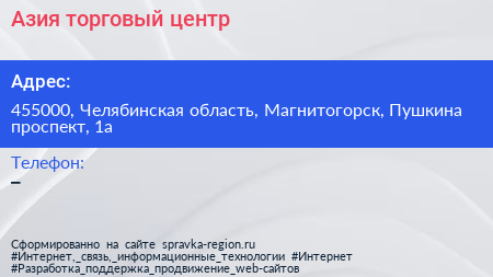 Азия, торговый центр по адресу 455000, Челябинская область, Магнитогорск, Пушкина проспект, 1а в дальнейшем Организация, размещена в следующих категориях: