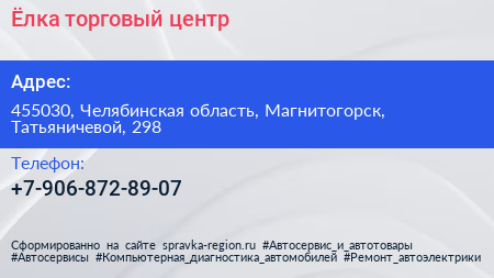 Ёлка, торговый центр по адресу 455030, Челябинская область, Магнитогорск, Татьяничевой, 298 в дальнейшем Организация, размещена в следующих категориях: