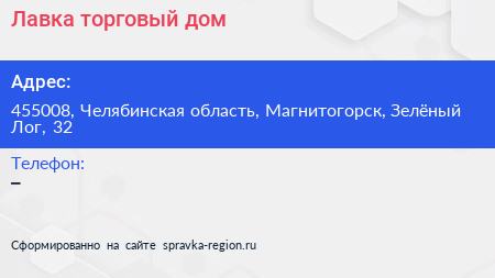 Лавка, торговый дом по адресу 455008, Челябинская область, Магнитогорск, Зелёный Лог, 32 в дальнейшем Организация, размещена в следующих категориях: