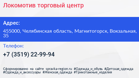Локомотив, торговый центр по адресу 455000, Челябинская область, Магнитогорск, Вокзальная, 35 в дальнейшем Организация, размещена в следующих категориях:
