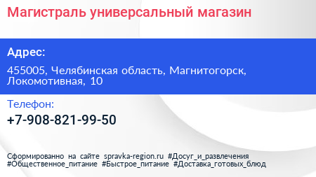 Магистраль, универсальный магазин по адресу 455005, Челябинская область, Магнитогорск, Локомотивная, 10 в дальнейшем Организация, размещена в следующих категориях: