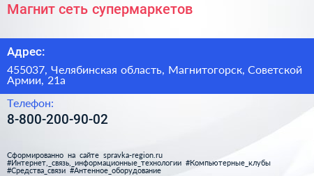 Магнит, сеть супермаркетов по адресу 455037, Челябинская область, Магнитогорск, Советской Армии, 21а в дальнейшем Организация, размещена в следующих категориях: