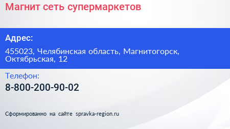 Магнит, сеть супермаркетов по адресу 455023, Челябинская область, Магнитогорск, Октябрьская, 12 в дальнейшем Организация, размещена в следующих категориях: