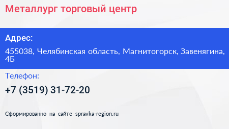 Металлург, торговый центр по адресу 455038, Челябинская область, Магнитогорск, Завенягина, 4Б в дальнейшем Организация, размещена в следующих категориях: