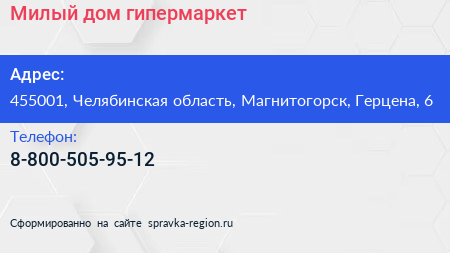 Милый дом, гипермаркет по адресу 455001, Челябинская область, Магнитогорск, Герцена, 6 в дальнейшем Организация, размещена в следующих категориях:
