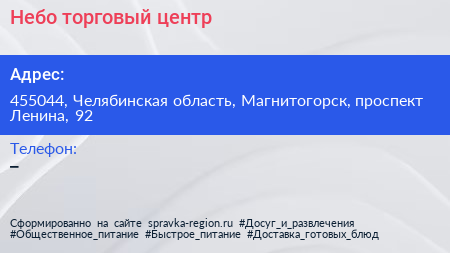 Небо, торговый центр по адресу 455044, Челябинская область, Магнитогорск, проспект Ленина, 92 в дальнейшем Организация, размещена в следующих категориях: