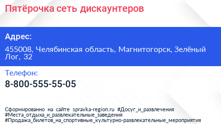 Пятёрочка, сеть дискаунтеров по адресу 455008, Челябинская область, Магнитогорск, Зелёный Лог, 32 в дальнейшем Организация, размещена в следующих категориях: