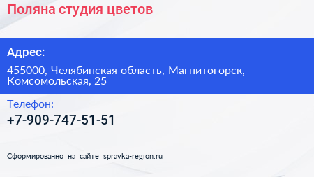 Поляна, студия цветов по адресу 455000, Челябинская область, Магнитогорск, Комсомольская, 25 в дальнейшем Организация, размещена в следующих категориях: