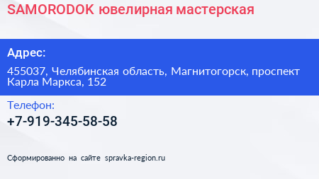 SAMORODOK, ювелирная мастерская по адресу 455037, Челябинская область, Магнитогорск, проспект Карла Маркса, 152 в дальнейшем Организация, размещена в следующих категориях: