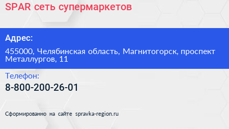 SPAR, сеть супермаркетов по адресу 455000, Челябинская область, Магнитогорск, проспект Металлургов, 11 в дальнейшем Организация, размещена в следующих категориях: