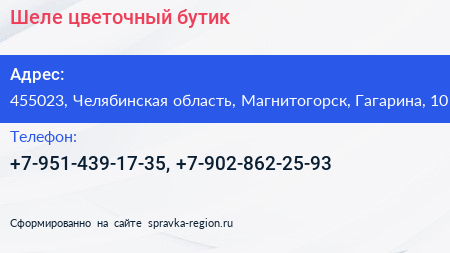 Шеле, цветочный бутик по адресу 455023, Челябинская область, Магнитогорск, Гагарина, 10 в дальнейшем Организация, размещена в следующих категориях: