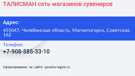 ТАЛИСМАН, сеть магазинов сувениров по адресу 455047, Челябинская область, Магнитогорск, Советская, 162 в дальнейшем Организация, размещена в следующих категориях: