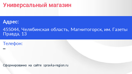 Универсальный магазин по адресу 455044, Челябинская область, Магнитогорск, им. Газеты Правда, 13 в дальнейшем Организация, размещена в следующих категориях:
