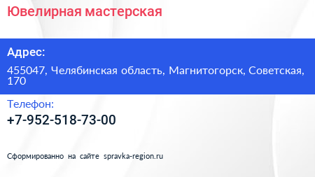 Ювелирная мастерская по адресу 455047, Челябинская область, Магнитогорск, Советская, 170 в дальнейшем Организация, размещена в следующих категориях: