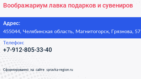 Воображариум, лавка подарков и сувениров по адресу 455044, Челябинская область, Магнитогорск, Грязнова, 57 в дальнейшем Организация, размещена в следующих категориях: