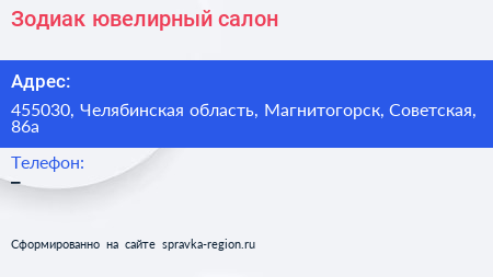 Зодиак, ювелирный салон по адресу 455030, Челябинская область, Магнитогорск, Советская, 86а в дальнейшем Организация, размещена в следующих категориях: