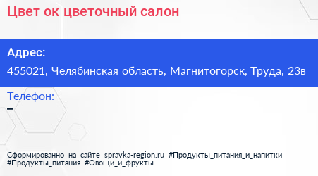 Цвет`ок, цветочный салон по адресу 455021, Челябинская область, Магнитогорск, Труда, 23в в дальнейшем Организация, размещена в следующих категориях: