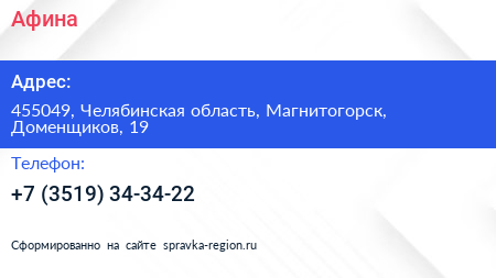 Афина по адресу 455049, Челябинская область, Магнитогорск, Доменщиков, 19 в дальнейшем Организация, размещена в следующих категориях: