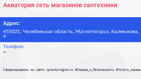 Акватория, сеть магазинов сантехники по адресу 455021, Челябинская область, Магнитогорск, Калмыкова, 4 в дальнейшем Организация, размещена в следующих категориях: