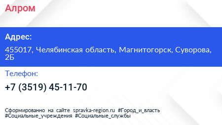 Алром по адресу 455017, Челябинская область, Магнитогорск, Суворова, 2Б в дальнейшем Организация, размещена в следующих категориях: