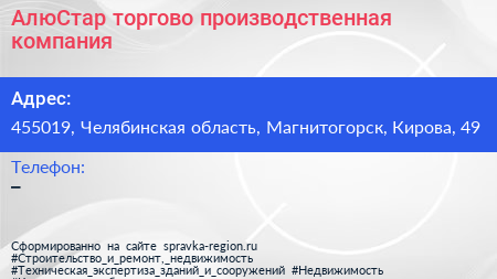 АлюСтар, торгово-производственная компания по адресу 455019, Челябинская область, Магнитогорск, Кирова, 49 в дальнейшем Организация, размещена в следующих категориях: