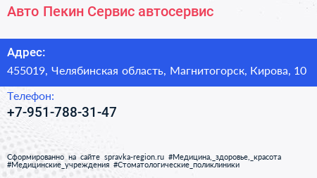 Авто Пекин Сервис, автосервис по адресу 455019, Челябинская область, Магнитогорск, Кирова, 10 в дальнейшем Организация, размещена в следующих категориях: