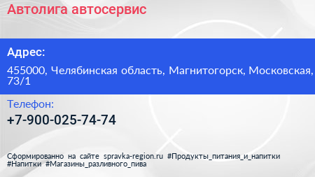 Автолига, автосервис по адресу 455000, Челябинская область, Магнитогорск, Московская, 73/1 в дальнейшем Организация, размещена в следующих категориях: