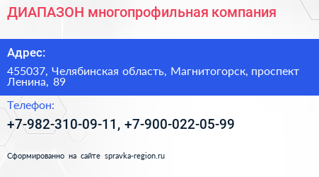ДИАПАЗОН, многопрофильная компания по адресу 455037, Челябинская область, Магнитогорск, проспект Ленина, 89 в дальнейшем Организация, размещена в следующих категориях: