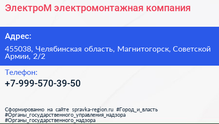 ЭлектроМ, электромонтажная компания по адресу 455038, Челябинская область, Магнитогорск, Советской Армии, 2/2 в дальнейшем Организация, размещена в следующих категориях:
