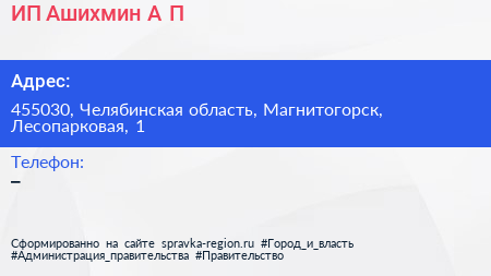 ИП Ашихмин А.П. по адресу 455030, Челябинская область, Магнитогорск, Лесопарковая, 1 в дальнейшем Организация, размещена в следующих категориях: