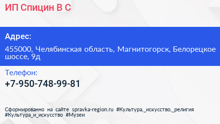 ИП Спицин В.С. по адресу 455000, Челябинская область, Магнитогорск, Белорецкое шоссе, 9д в дальнейшем Организация, размещена в следующих категориях: