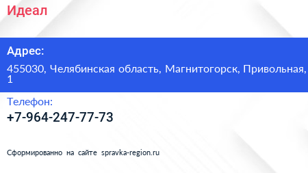 Идеал по адресу 455030, Челябинская область, Магнитогорск, Привольная, 1 в дальнейшем Организация, размещена в следующих категориях: